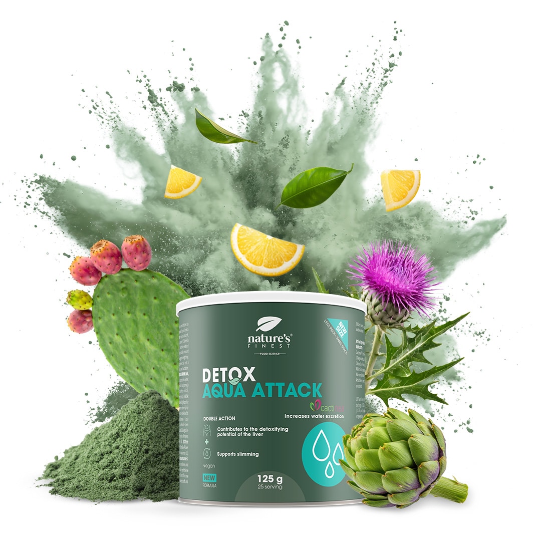 Detox Aqua Attack contient l’ingrédient breveté Cactinea™, qui favorise l’élimination de l’eau, ainsi que de l’extrait d’artichaut, qui stimule directement la perte de poids.