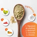 Ingrédients : poudre d’inuline, extrait de tige de figuier de Barbarie 10:1 (Opuntia ficus-indica), arôme mangue, arôme citron, extrait de valériane (Valeriana officinalis, racine), stabilisant : cellulose, Rebersa® chlorhydrate (extrait de Berberis aristata) dont 97 % de chlorhydrate de berbérine, extrait de curcuma (Curcuma longa, racine), poudre de cannelle (Cinnamomum zeylanicum, écorce), édulcorant : glycosides de stéviol issus de la stévia, picolinate de chrome. Contient des sucres naturellement présents.