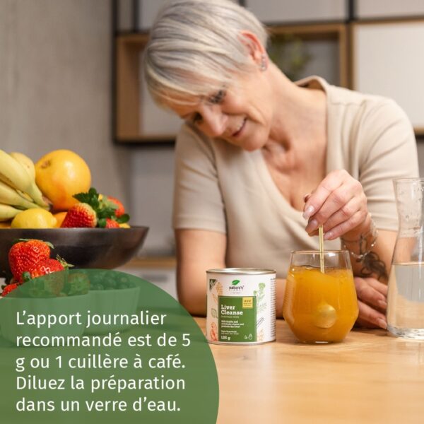 La dose journalière recommandée est de 5 g, soit 1 cuillère à café. À mélanger dans un verre d’eau.