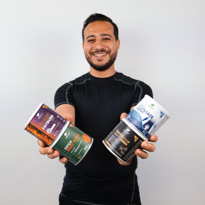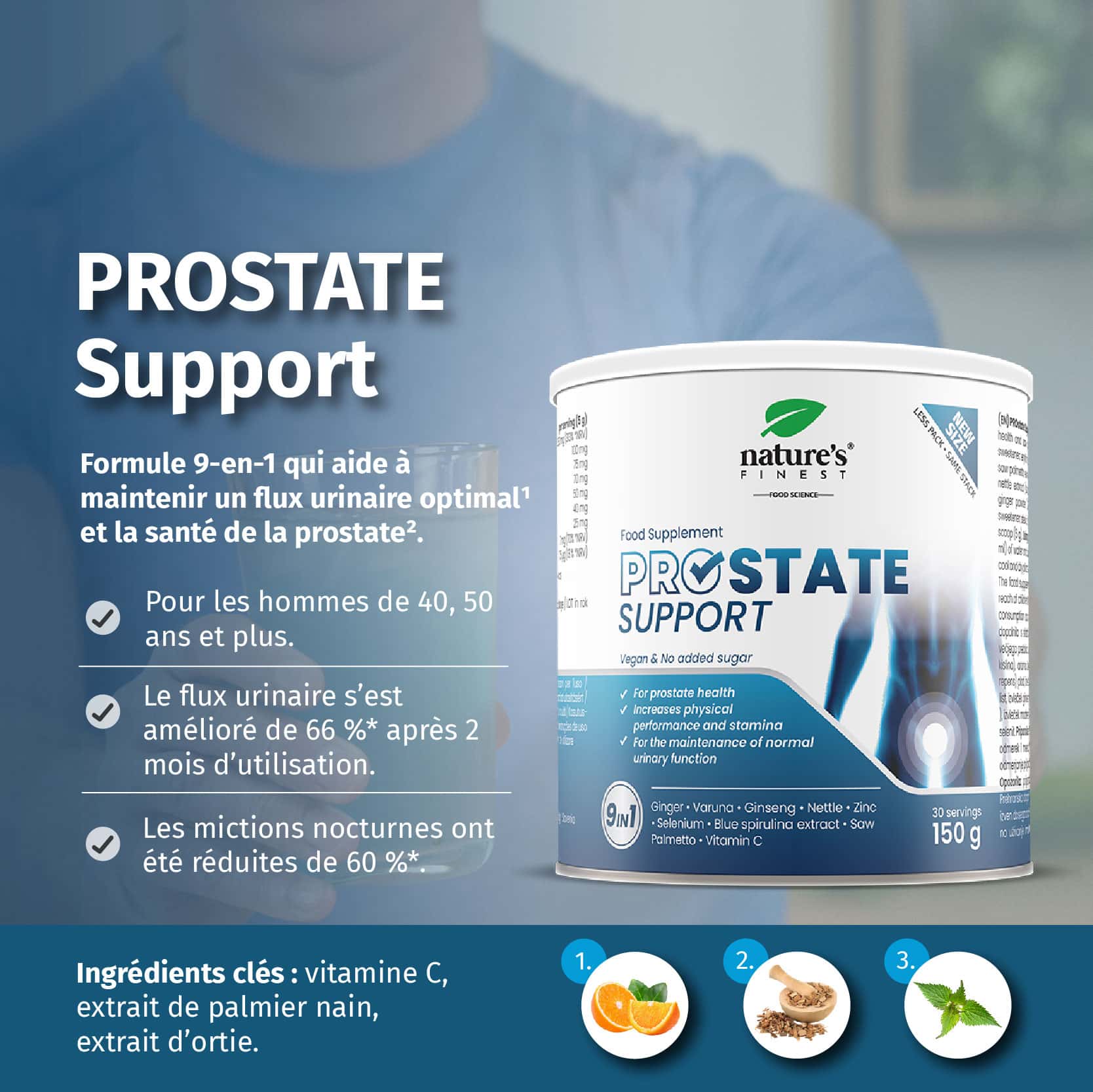 Ingrédients : inuline, édulcorant : érythritol, vitamine C (acide ascorbique), arôme de myrtille, stabilisant : cellulose, extrait de fruits de palmier nain (Serenoa repens), extrait d’écorce de varuna (Crataeva nurvala), extrait de feuilles d’ortie (Urtica dioica), extrait de ginseng (Panax ginseng), gluconate de zinc, poudre de gingembre (Zingiber officinale), extrait de spiruline bleue (Arthrospira platensis), édulcorant : glycoside de stéviol, sélénite de sodium.