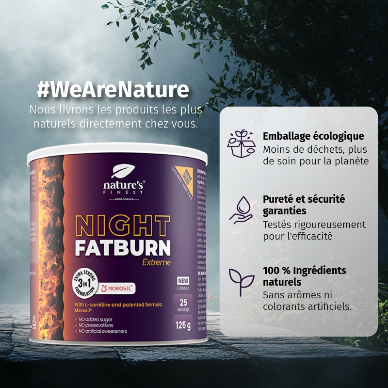 Night FatBurn Extreme est conçu pour soutenir les processus naturels de votre corps liés à la gestion du poids et au métabolisme de l’énergie, surtout pendant le sommeil. Il contient également des ingrédients qui favorisent la relaxation et la qualité du sommeil, ce qui peut aider davantage à gérer le poids corporel.