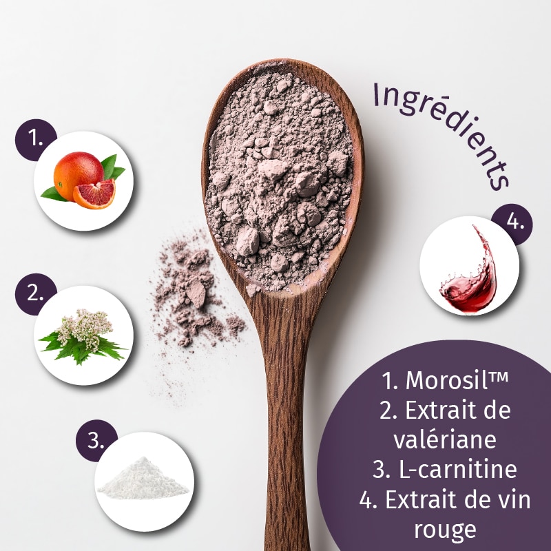 Ingrédients : Amidon de tapioca, édulcorant érythritol, Morosil™ (orange rouge – Citrus sinensis (L.) Osbeck), arôme naturel d’orange (3 %), extrait de vin rouge (Vitis vinifera), stabilisant : cellulose, L-carnitine, extrait de racine de valériane (Valeriana officinalis L.), édulcorant : glycosides de stéviol issus de la stévia.