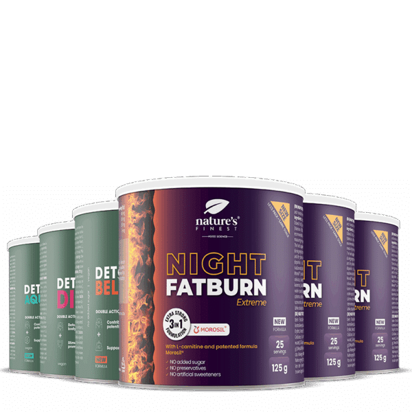 • Night Fatburn Extreme : Une formule qui soutient la perte de poids et aide à stabiliser le poids corporel⁶. Contient la formule brevetée Morosil®, un extrait de vin rouge, de la L-carnitine ainsi qu’un extrait de valériane qui aide à maintenir un sommeil naturel et contribue à une relaxation optimale.