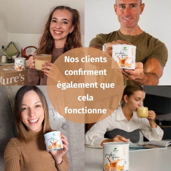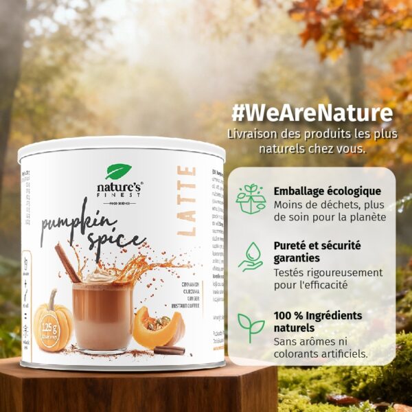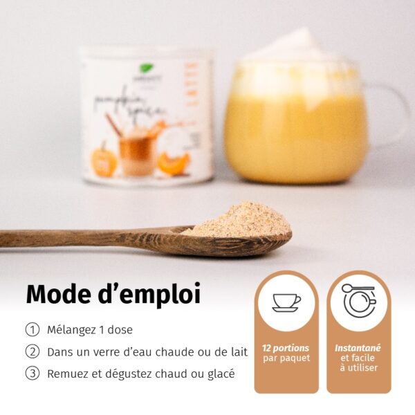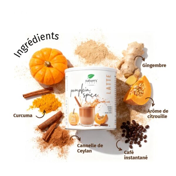 Ingrédients : poudre de boisson au riz (riz, bêta-glucanes d’avoine, huile de tournesol, sel), poudre d’agave, édulcorant : érythritol, poudre de boisson à la noix de coco (crème de coco, maltodextrine de riz), arôme de citrouille, café instantané (Coffea arabica L.), arôme de vanille, poudre de cannelle (Cinnamomum zeylanicum, écorce), poudre de gingembre (Zingiber officinale, racine), extrait de curcuma (Curcuma longa L., rhizome).
